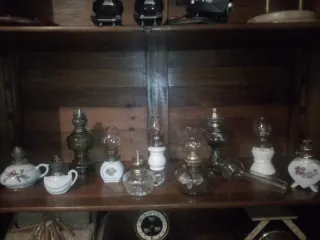 Conjunto de diez lámparas de aceite decorativas, ideales para coleccionistas o para añadir un toque vintage a tu hogar. - Variedad de tamaños y diseños. - Materiales como vidrio, porcelana y cerámica. - Algunas presentan detalles florales pintados. Finales del S. XIX, art, deco y vintage. Todas originales IDEAL PARA COMENZAR TU COLECCIÓN