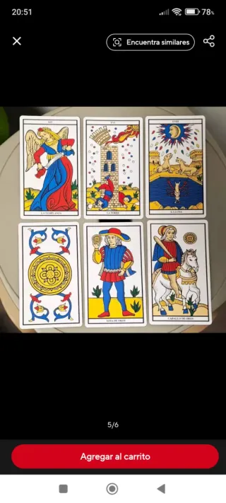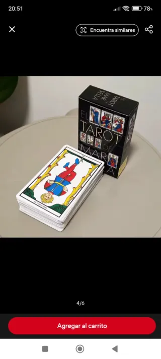 Baraja de cartas del Tarot de Marsella. - Contiene 78 cartas, 22 Arcanos Mayores y 56 Arcanos Menores a todo color. - Ideal para coleccionistas y aficionados a la cartomancia. - En su estuche original sin abrir. - Tamaño 10,5 cm. alto x 6 cm. ancho. - Incluye caja original. - Diseño clásico del Tarot de Marsella. - Formato usado por grandes tarotistas.