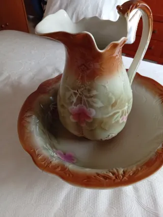 Palangana y jarra de principios del siglo XX, más concretamente de 1900, perteneció a mí bisabuela. Conjunto vintage de palangana y jarra con un bonito diseño floral. Algún pequeño desgaste por pequeña rotura casi imperceptible. - Palangana con borde ondulado. - Jarra con asa. - Decoración floral en tonos rosas y verdes.