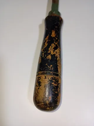 Herramienta antigua con un diseño clásico y un mango de madera desgastado. - Mango de madera con acabado negro y detalles dorados. - Varilla metálica con pintura verde y detalles oxidados. - Cabezal metálico con pieza de cobre o bronce.