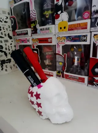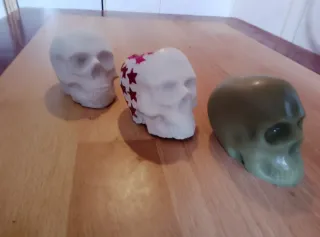 Conjunto de tres calaveras decorativas para darle un toque único a tu espacio. - Calavera blanca con estrellas rojas. - Calavera blanca lisa. - Calavera verde.