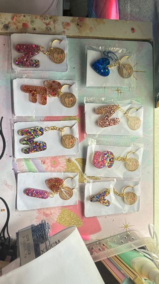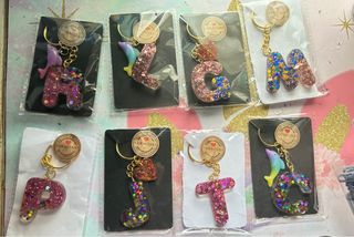 Llaveros hechos a mano con resina, perfectos para dar un toque personal. - Diseños variados con letras y figuras. - Acabado brillante con glitter. - Incluyen anilla dorada.