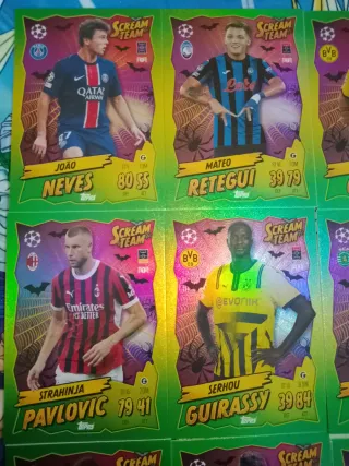 Colección de cromos Topps Scream Team de la Champions League 2024-2025. - Cromos de jugadores destacados. - Diseño temático de Halloween. - Incluye varios jugadores como Neves, Retegui, Guirassy, De Ligt, Simons, entre otros. Cartas en perfecto estado. No rebajo precio ni acepto ofertas. No me interesan cambios. No vendo sueltas