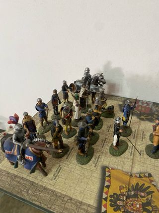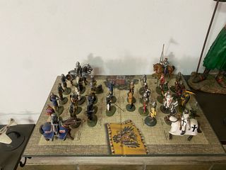 Colección de figuras de plomo que representan diferentes épocas históricas. - Figuras de caballería y soldados. - Detalladas armaduras y vestimentas. - Base temática de tablero de juego.