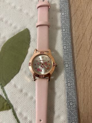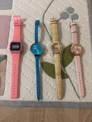 Conjunto de cuatro relojes con diferentes diseños y correas. - Reloj digital rosa. - Reloj analógico beige con detalles dorados. - Reloj analógico rosa con detalles.