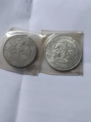 Dos monedas de plata conmemorativas de los Juegos Olímpicos de México 1968. Necesita limpiarlas. - Una moneda muestra el escudo nacional de México. - La otra moneda presenta la temática de los Juegos Olímpicos de 1968.