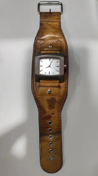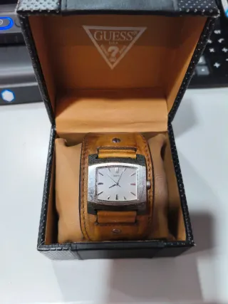 Reloj analógico de la marca Guess con una pulsera ancha de cuero. - Pulsera de cuero marrón. - Caja rectangular metálica. - Cierre con hebilla y pasador. Caja y libro original.