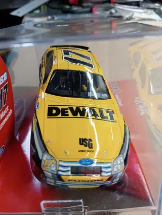 Coche de slot Scalextric Ford Fusion del equipo NASCAR número 17. - Réplica detallada del coche de carreras. - Diseño amarillo con patrocinadores como DeWalt y Goodyear. - Escala 1:32.