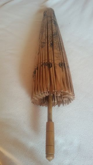 Preciosa sombrilla o parasol japones, compara en los años 70 en Japón, creo que de papel de arroz recubierto de aceite de paulownia, con mango y varillas en bambu, decorado con dragones y caracteres japoneses, fondo beige y decoración en negro. Tiene 70 cm de largo total y 51 cm el diametro del papel. Esta algo deteriorado, pero nunca se ha usado. Gastos de envío no incluidos. 213CP-01