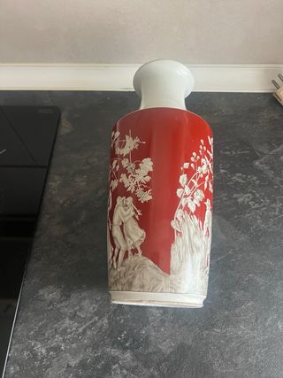 Elegante jarrón de cerámica con un diseño clásico. - Base de color rojo intenso. - Decoración en relieve con motivos de vides y figuras danzantes. - Parte superior blanca con borde dorado.