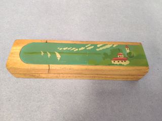 Antiguo estuche escolar de madera, también conocido como plumier, con la tapa pintada a mano de un paisaje marino, es de dos piso, con señales de uso como se puede ver en las fotos pero bien conservado. Mide 24 cm de largo, 6,3 cm de ancho y 4,3 cm de alto. Gastos de envío no incluidos. 205CP - Material: Madera. - Diseño: Paisaje con veleros y edificaciones. - Forma: Rectangular alargada.
