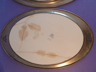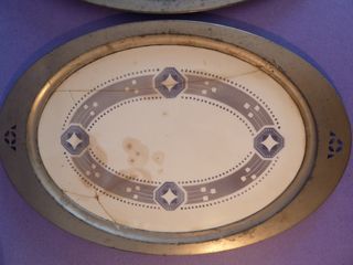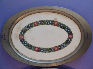 Bandeja ovalada de porcelana, con motivos geométricos en el centro en grises y ala borde en metal, con sello del fabricante alemán de Nuremberg Max Dannhorn, fabricada entre 1895 y 1921, mide 42.5x27,5. La porcelana esta muy deteriorada con fisuras y el metal afectado por la humedad. Gastos de envío no incluidos. 066VP-01-CP