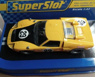 Réplica del coche de carreras Ford GT40 con el dorsal 29, en color amarillo. - Modelo de la marca Superslot. - Decoración de competición. - Escala 1:32. - Compatible con pistas Scalextric, Ninco, Superslot, Carrera, etc.