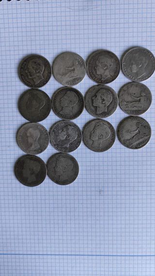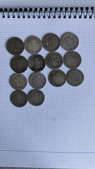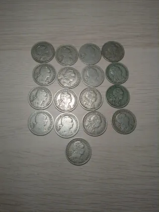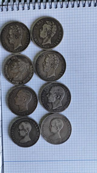 8 monedas originales de 5 pesetas de finales del siglo XIX. Se vende preferiblemente el lote completo. Preferiblemente envío Precio por el lote de 8: 320€ = 40€ ud. * 8 Precio por unidad: 45€