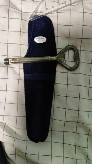Abrebotellas antiguo chapado en plata. Incluye funda original de tela azul con etiqueta “chapado plata”. Pieza vintage, ideal para coleccionismo o decoración. Solo envíos.