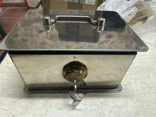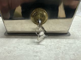 Caja de caudales metálica con cerradura y llave. - Diseño clásico de los años 60. - Acabado en acero inoxidable. - Asa para transporte. - Cerradura de latón con llave.