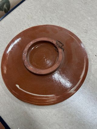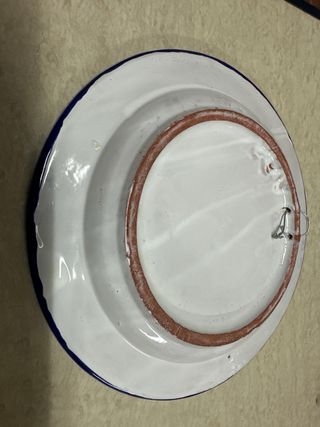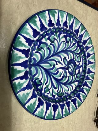 Precioso plato decorativo de cerámica con un diseño tradicional. - Motivos florales en azul y verde. - Borde decorado con greca. - Pieza de colección.