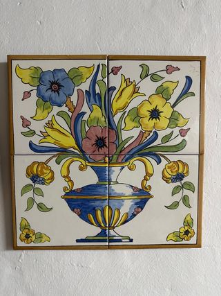 Precioso cuadro decorativo compuesto por cuatro azulejos de cerámica, pintado a mano con un vibrante diseño floral. - Diseño de flores y jarrón. - Colores vivos: azul, amarillo, rosa y verde. - Marco de madera incluido.