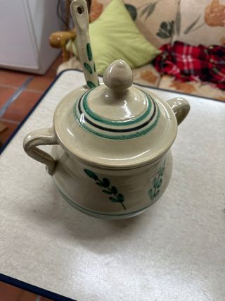 Jarra de cerámica hecha a mano con un diseño único. - Incluye cucharón a juego. - Decorada con motivos vegetales en verde. - Acabado en tono beige.