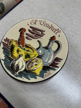 Plato decorativo artesanal con un diseño de ingredientes culinarios. Representa un mortero con ingredientes, ajos, limones y una botella de aceite. - Diseño pintado a mano. - Motivo de cocina mediterránea. - Firma del artista 'ARIFI' visible.