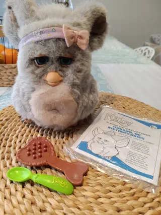 Furby interactivo en español, modelo de 2005. Incluye sus accesorios originales. - Furby en idioma español. - Incluye manual de instrucciones. - Viene con cepillo y cuchara.
