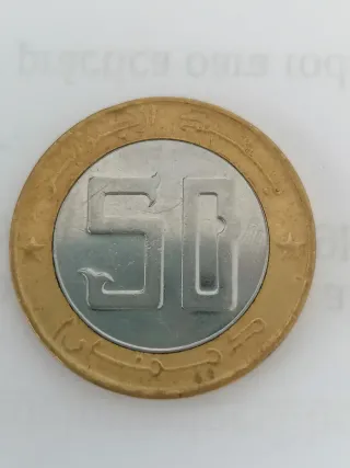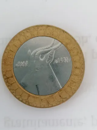 Moneda conmemorativa antigua de Argelia con un diseño detallado en el centro. - Borde exterior dorado. - Diseño central plateado con la silueta de un animal con cuernos. - Inscripciones 2010 y 1430 visibles. Precio simbólico. Escucho ofertas.
