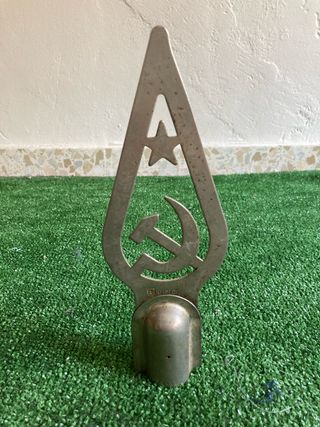 Pica de bandera original de la Unión Soviética. Presenta el icónico símbolo de la hoz y el martillo junto a una estrella. - Material metálico. - Diseño con estrella y hoz y martillo. - Base para insertar el mástil.