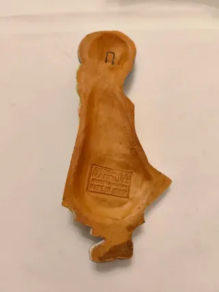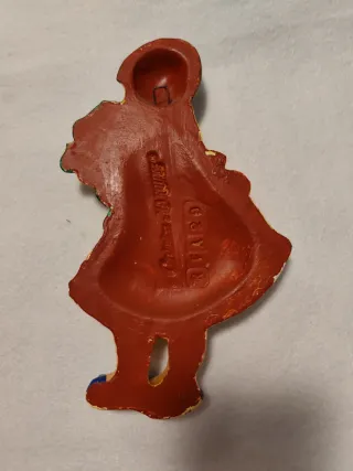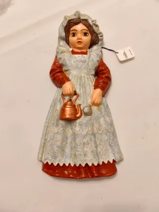 Figura de artesanía de la marca Marquez. - Diseño detallado de una mujer con delantal y cofia. - Sostiene una tetera y un infusor de té. - Colores vivos y acabados cuidados. - Figura hecha artesanalmente con etiqueta y sello grabado en la parte posterior que lo confirma -Pieza de colección Figura para colgar en la pared