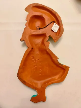 Figura decorativa de cerámica de Artesanía Marquez. Representa a una niña con sombrero y vestido. - Detalle de flores en la mano. - Colores vivos y alegres. - Pieza de colección. - Figura hecha de manera totalmente artesanal,es vintage y se encuentra en perfectas condiciones, tiene etiqueta que la identifica y el grabado en la parte posterior Figura para colgar en la pared.