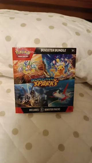 Caja de Entrenador Élite de Pokémon, colección Scarlet & Violet: Surging Sparks. - Contiene cartas de Pokémon TCG. - Diseño con Pikachu y elementos dorados. - Apto para mayores de 6 años.