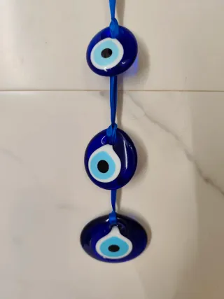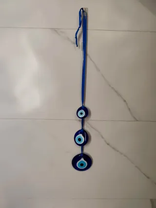 Este colgante decorativo de cristal presenta tres amuletos del ojo turco, conocidos por su diseño protector. Cuelga de una cinta azul. - Tres amuletos del ojo turco. - Diseño en tonos azules y blancos. - Cuelga de una cinta azul.