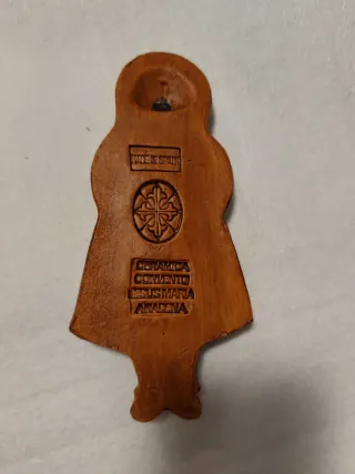 Figura decorativa de cerámica, elaborada artesanalmente en el Convento de Jesús María. Representa una figura femenina con un niño en brazos, con un diseño tradicional y colorido. - Material: Cerámica. - Técnica: Artesanal. - Motivo: Figura femenina con niño. - Origen: Convento Jesús María. de Aracena -Sello grabado en la parte posterior que lo acreditan - Figura para colgar en la pared.