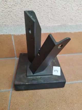Pieza decorativa de hierro con un diseño moderno y abstracto. - Base cuadrada de hierro. - Elementos verticales y angulares. - Acabado en color negro. - Medidas: 14X14X24