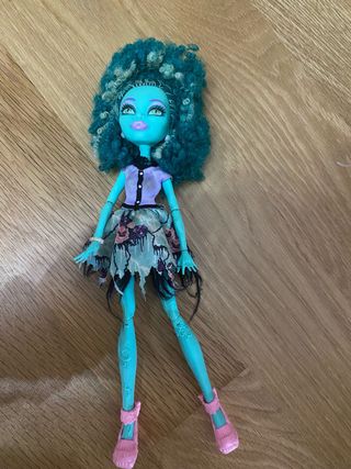 Muñeca Monster High Honey Swamp con su característico cabello rizado y piel azul. - Vestido con detalles desgarrados y estampado floral. - Zapatos rosas. - Brazalete en la muñeca.