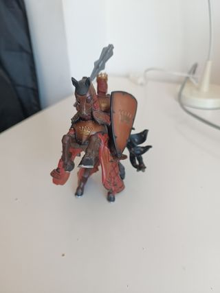 Preciosa figura de caballero medieval a caballo. Es de color rojo y dorado, con detalles muy cuidados. - Figura de caballero medieval. - Montado en un caballo con cuernos de ciervo. - Incluye escudo y espada. - En buen estado.