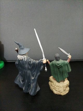 Pareja de figuras de El Señor de los Anillos. Son dos figuras detalladas de Gandalf y Frodo. - Incluyen dos figuras: Gandalf y Frodo. - Están en buen estado. - Ideales para coleccionistas. 10 y 9 cm sin espada El precio es por las 2