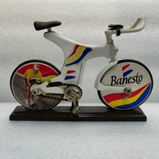 Replica Bicicleta Indurain Pinarello Espada Banesto. Comprada en su día (aprox hace 30 años) como merchandising en la Vuelta España. Estructura de metal. La vendian así, sin caja ni nada. Solo con el soporte. Tiene algo de suciedad y alguna pegatina un poco despegada por los bordes debido a los años que han pasado. Mide unos 18cm de largo por 13 de alto.
