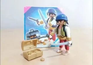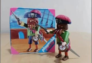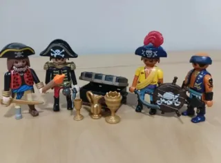 Conjunto de 4 figuras de Playmobil con temática pirata y accesorios. - Incluye un cofre del tesoro. - Varios accesorios como jarras y copas doradas. - Figuras con sombreros de pirata y espadas. Opción de agrupar anuncios y de realizar envíos ordinarios por Correos