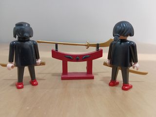 Set de dos figuras de Playmobil representando guerreros asiáticos. Samurais.Incluye un armero con espadas. - Dos figuras de guerreros con vestimenta negra y detalles dorados. - Accesorios: armero rojo y dos espadas doradas. Opción de agrupar anuncios y de realizar envíos ordinarios por Correos