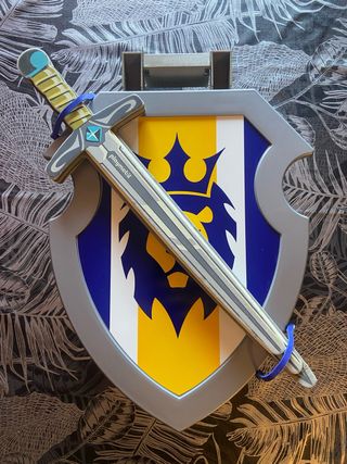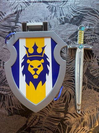 Set de escudo y espada de Playmobil con diseño de león y corona. - Escudo con detalles en azul, blanco y amarillo. - Espada con empuñadura y detalles plateados. - Viene con todos los muñecos además de estar con todos los accesorios - En perfectas condiciones