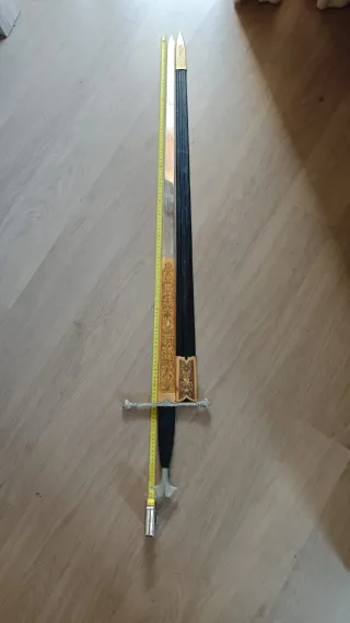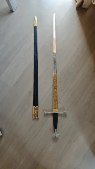 Espada decorativa con su funda a juego. Ideal para coleccionistas o como elemento de atrezo. - Hoja metálica con grabados dorados. - Empuñadura y pomo detallados. - Funda negra con adornos dorados.