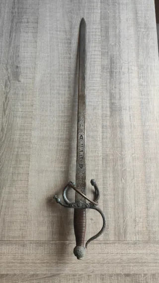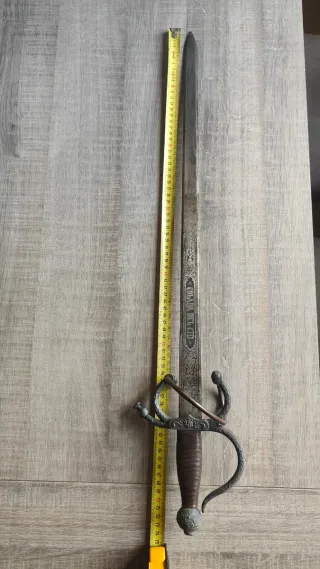 Espada decorativa con inscripciones en la hoja. - Hoja grabada con motivos ornamentales. - Guarda y puño metálicos. - Diseño inspirado en espadas históricas.