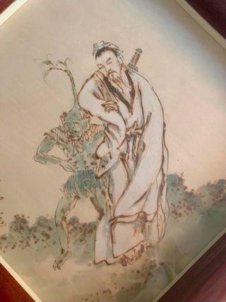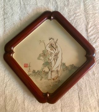 PRECIOSO CUADRO CHINO REALIZADO CON LA TÉCNICA DE QUEMADO EN MADERA “ WOODBURNING “, EL DIBUJO REPRESENTA A UN SABIO O GUERRERO ANCIANO CON UNA ESPADA AYUDADO POR UNA CRIATURA MÍTICA, REALIZADO EN MADERA LACADA Y CON CRISTAL PROTECTOR. TIENE SELLO DE IDENTIDAD EN LA PARTE TRASERA, SE ENTREGA CON SU CAJA ORIGINAL. MEDIDA 31CM DE LADO.