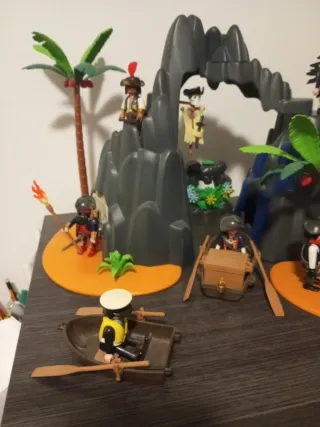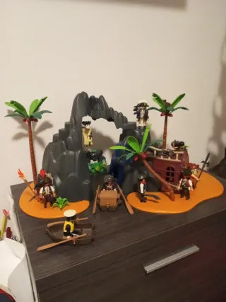 Set de Playmobil de una isla pirata con figuras y accesorios. - Incluye barco pirata, cueva y palmeras. - Varias figuras de piratas y personajes. - Accesorios como remos, espadas y cofre.