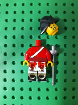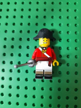 MiniFigura exclusiva coleccionistas oficial ingles con atuendo de época y espada. - Casco negro. - Chaqueta roja con detalles dorados. - Pantalones blancos con polainas marrones. - Espada plateada.