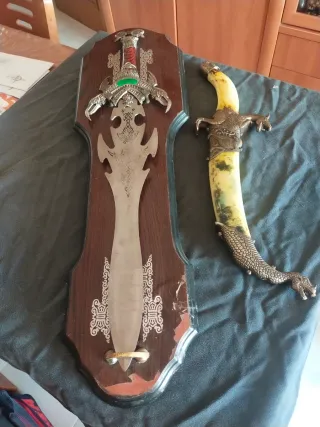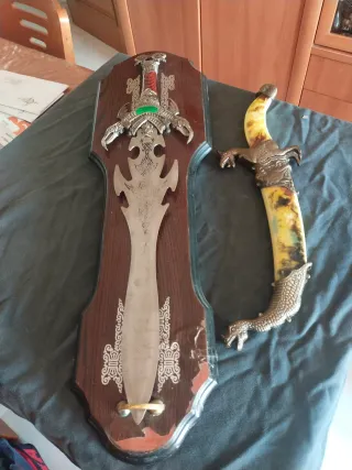 Set de espada y daga decorativas, perfectas para exhibición. - Espada montada en tabla de madera. - Daga con empuñadura detallada.