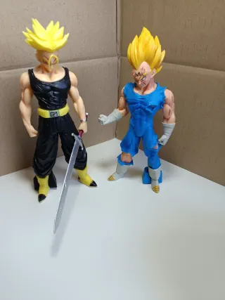 Lote de figuras de colección de Majin Vegeta y Trunks. Figura de Majin Vegeta con traje azul y Trunks con traje negro y espada. Tamaño 20cm de alto. Nuevo, se envía con bolsa de burbujas para su protección.