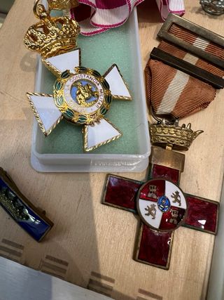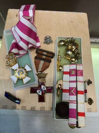 Conjunto de medallas y distintivos militares. no vendo sueltos - Medalla con cinta rosa y blanca. - Cruz de caballero con esmaltes. - Pasador de varias cintas. - Varios gemelos y abotonaduras doradas. - Insignia metálica con dos espadas cruzadas.No vendo sueltos