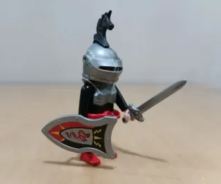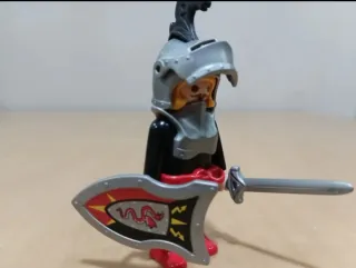 Figura de Playmobil de un guerrero con armadura y escudo. - Casco plateado con penacho negro. - Armadura gris. - Escudo con diseño de dragón rojo y amarillo. - Espada plateada. Opción de agrupar anuncios y de realizar envíos ordinarios por Correos