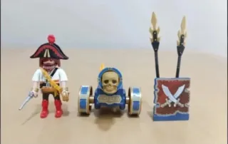 Set de Playmobil con temática pirata. Incluye un pirata, un cañón con diseño de calavera y un armero con hachas. - Figura de pirata con espada y antorcha. - Cañón con detalles en rojo y negro. - Soporte para dos hachas. - Hachas incluidas. Opción de agrupar anuncios y de realizar envíos ordinarios por Correos